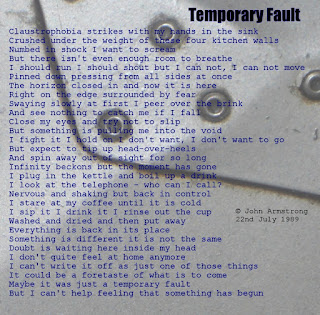 Temporary Fault could be a song about mental illness, but is about the sudden realization that a 'hinge-moment' is occurring and that a life affecting decision has to be made; producing a momentary instability or a 'temporary fault' - as shown on 1970's television screens when there was a problem with the transmitter.